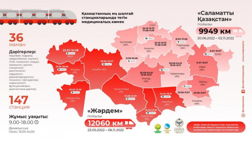 – Сонымен қатар, біздің «Samruk-Kazyna Trust» қоры бірыңғай қайырымдылық операторы саналатын «Самұрық-Қазына» АҚ компаниялар тобының еңбеккерлері де пойыз дәрігерлеріне тегін әрі толық қарала алады. Ал шалғай өңірлерде осы компаниялар тобында еңбек ететін қарапайым еңбек адамдары баршылық екені белгілі», – деп атап өтті «Samruk-Kazyna Trust» әлеуметтік жобаларды дамыту қорының бас директоры Альфия Адиева.