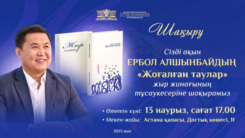 Астана қаласындағы Ұлттық академиялық кітапханада ақын, халықаралық «Шабыт» фестивалінің Гран-при иегері Ербол Алшынбайдың «Жоғалған таулар» атты жаңа жыр жинағының тұсаукесері өтеді, деп хабарлайды El.kz ақпараттық агенттігі.
