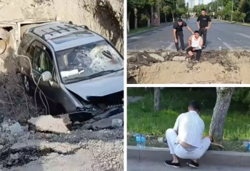 Таразда көлік көше ортасындағы үлкен шұңқырға түсіп кетті