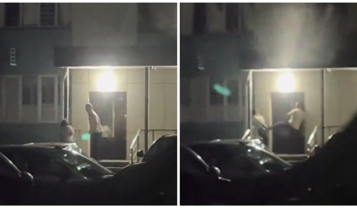Бейнежазбадан ер адамның көп қабатты тұрғын үйдің кіреберісінде әйелді ұрып жатқанын көруге болады. Кадрларда ер адамның алдымен құрбанын тепкілеп, кейін алақанымен ұрғаны көрінеді.