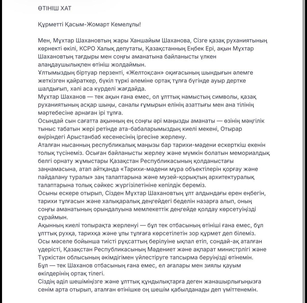Ақынның киелі топырақта жерленуі – отбасының өтініші ғана емес, бұл ұлттық рухқа, тарихқа және ұлы тұлғаға көрсетілетін зор құрмет, – делінген хатта.