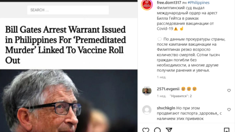 Әлеуметтік желілерде ауыр қылмыс бойынша Филлипин соты Билл Гейтсті COVID-19 қарсы вакциналармен жасалған «қасақана кісі өлтіргені» үшін қамауға алу туралы ордер бергені туралы ақпарат тарады. Бұл өтірік. Бұл туралы stopfake.kz сайтына сілтеме жасай отырып El.kz ақпараттық агенттігі хабарлайды.