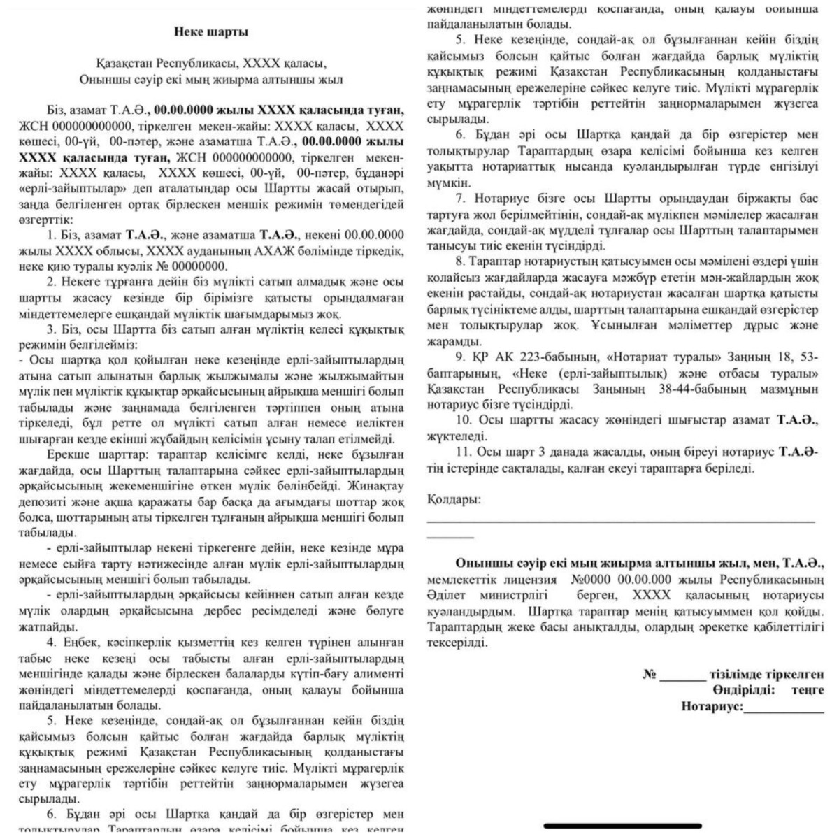 Бұл құжат ҚР Неке (ерлі-зайыптылық) және отбасы туралы кодексі арқылы реттеледі және белгілі талаптар орындалған жағдайда толық заңдық күшке ие болады.