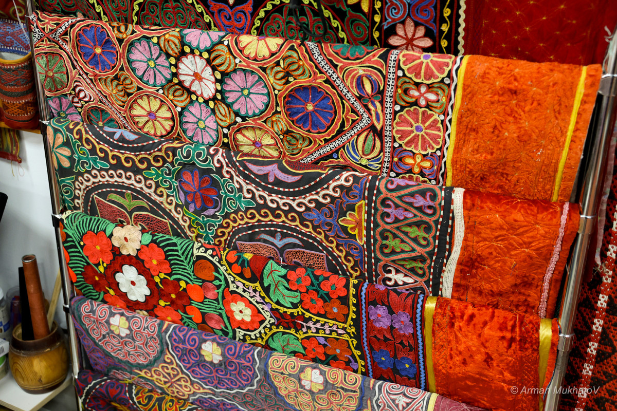 Менің қазір тігіп жатқаным – тұскиіз. Тұскиіз арнайы бізкесте әдісімен тігіледі. Құрал ретінде «қармақ біз» қолданылады. Әртүрлі жіпті пайдаланамыз. Тұскиіздің ортасын алдымен кестелеп, ең соңында көмкереміз. Осы жіптердің үйлесімі арқылы өрнек бедерленеді. Негізгі матасы – таза, сапалы мақта немесе жібек болғаны дұрыс. Себебі тұскиіз – тек сәндік бұйым емес, үйдің төрін айшықтайтын өнер туындысы, – дейді қолөнер шебері.
