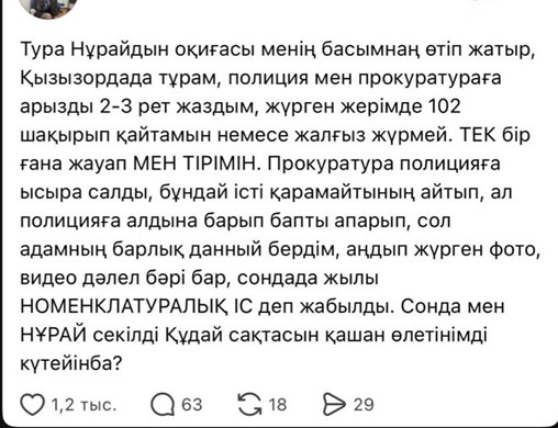 Қызылорда қаласының тұрғыны Жазира Қуанышбай әлеуметтік желідегі парақшасында жарты жылдан бері бейтаныс адамның өзін аңдып жүргенін жазып, шұғыл көмек сұрады. Айтуынша, құзырлы органдар арызын қабылдамаған.