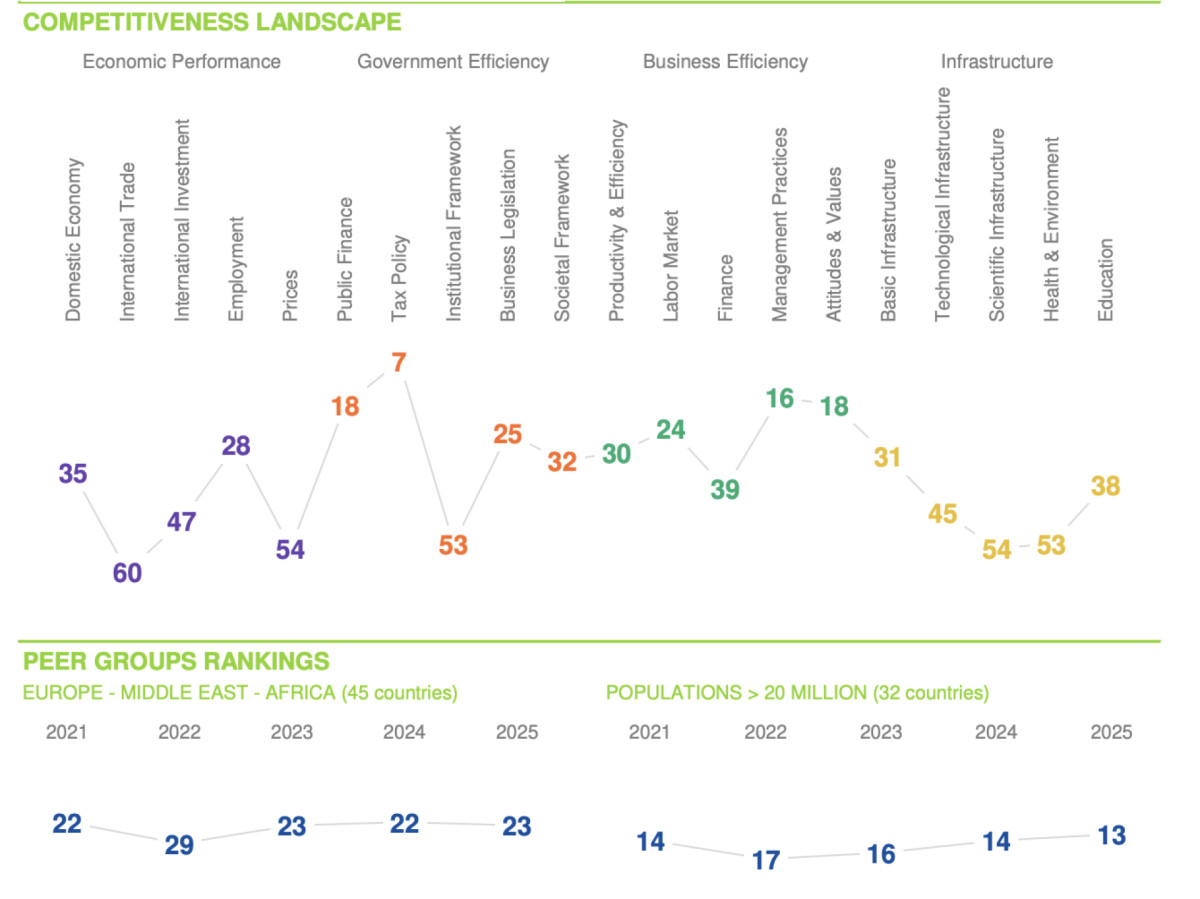 Қазақстан 69 елдің ішінде 34-орынға жайғасты. Бұл туралы халықаралық IMD (Халықаралық менеджментті дамыту институтының) World Competitiveness Ranking 2025 рейтингінің деректеріне сілтеме жасай отырып El.kz интернет порталы хабарлайды.