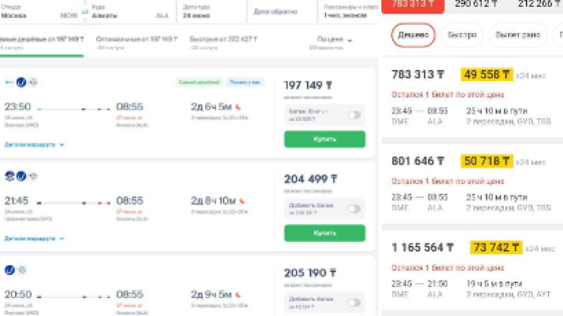 Baza мәліметінше, Астана уақытымен сағат 16:00-де Мәскеуден Алматыға дейінгі ең арзан билет 33 мыңнан 48 мың рубльге дейін тұратын (175 мыңнан 255 мың теңгеге дейін), деп хабарлайды El.kz ақпараттық агенттігі.
