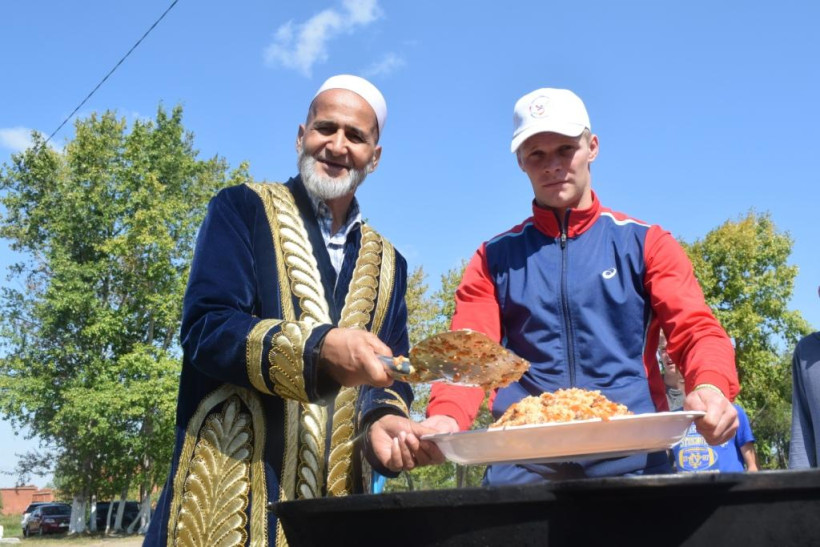 Готовить плов начали сразу же по приезду. Для этого с собой привезли большой казан, в который помещается 250 порций национального узбекского блюда. Ответственным за угощение стал повар со стажем Асадулла Давлятов, который за раз на Курбан-айт может накормить 1200 человек.