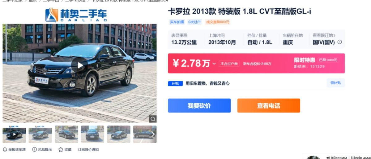 Toyota Corolla 2013 года с двигателем 1.8 литра обойдется покупателю в Китае в 2 миллиона тенге. Это популярная и надежная модель, но расходы на ее легализацию будут значительными.