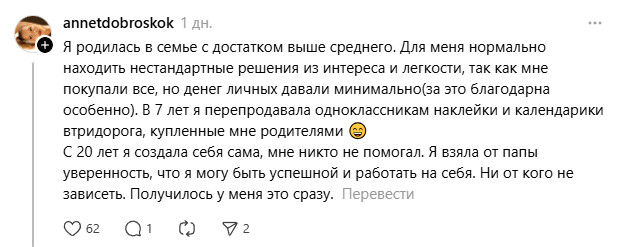 Для одних “нормой” было лето в британских колледжах и канадских школах, а для других – подаренная квартира к 18-летию или первый полёт в Лондон первым классом. “Мне тогда казалось, что так живут все”, – пишет участница обсуждения.