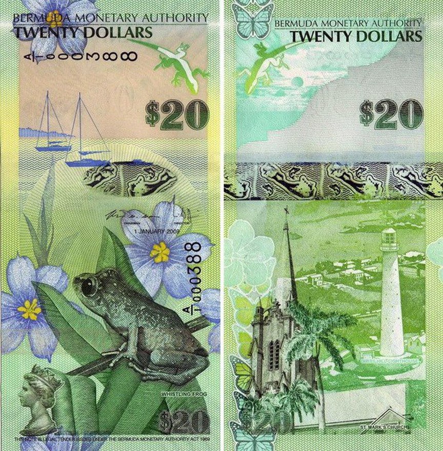 Бермудские доллары выделяются вертикальной ориентацией и пастельной палитрой. 2 доллара (синяя) — мост Сомерсет; 5 (розовая) — церковь Святого Петра; 10 (пурпурная) — бабочки и растения; 20 (зеленая) — маяк Гиббса-Хилл; 50 (желтая) — церковь Святого Иоанна; 100 (красная) — парламент с треугольником Бермуд в геометрической сетке. Тропические цветы, черепахи и рифы добавляют шарма, делая эти купюры коллекционными открытками островного архипелага.