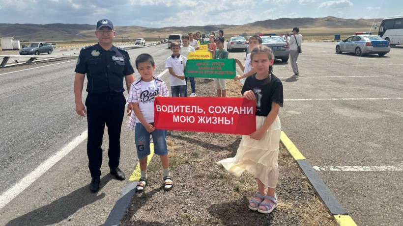Дети выступили с призывом обеспечить безопасность каждого ребенка на дороге, защитить маленького пассажира и пешехода, когда везешь его в автомобиле или идешь с ним по проезжей части. Внимание водителей они обращали с помощью плакатов, на которых было написано: “Жүргізуші, ұмытпа сен жақындарыңа керексің”, “Жүргізуші, асықпа, балалардың өмірін сақта”, “Водитель, береги жизнь ребенка!”, “Водитель, сохрани мою жизнь”, “Әке, ақырын жүр, біз сені күтеміз”. Дети стояли на обочине дороги, в безопасном месте.
