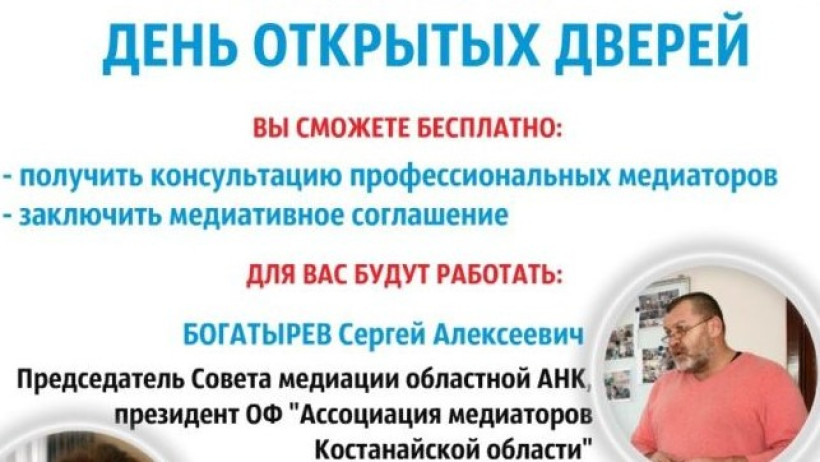 В этот день будут работать председатель Совета медиации областной ассамблеи народа Казахстана Сергей Богатырев, член совета медиации ОАНК, судья Костанайского областного суда в отставке Людмила Прохорова, профессиональный тренер-медиатор Игорь Зуев.