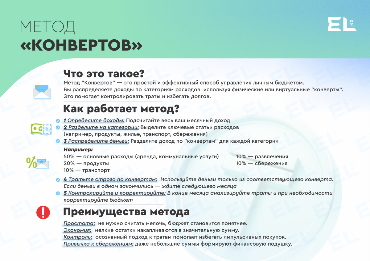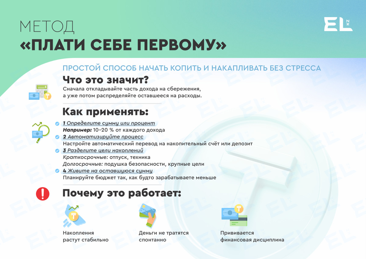 Пример: Если ваш доход 250 000 тенге в месяц, откладывайте 25 000 тенге сразу после зарплаты. За год это даст 300 000 тенге, не считая возможных процентов от вклада.