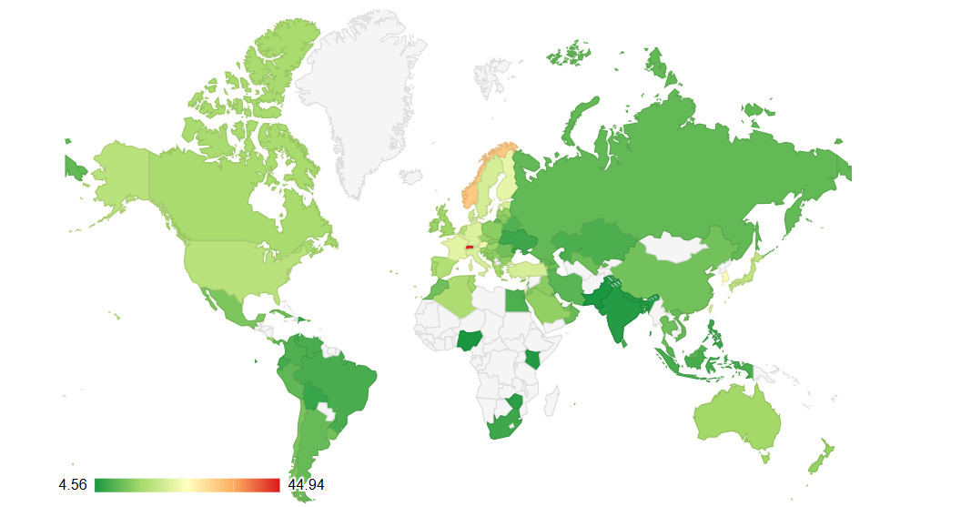 Минимальные показатели зафиксированы в странах с низким уровнем дохода и ограниченным доступом к животному белку.
