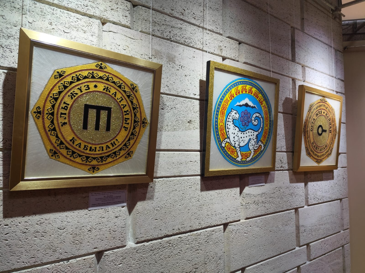 На выставке отдельное место занимает подарок городу Алматы от художника. В японских техниках, дополненных авторской методикой, он написал герб города, с точностью воспроизведя все тонкости и детали.