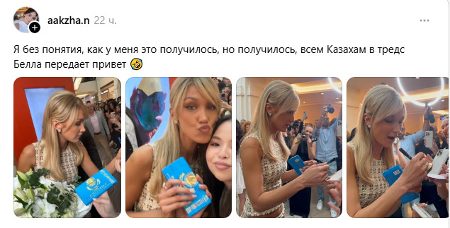 Пользовательница с ником aakzha.n поделилась кадрами встречи, написав: «Я без понятия, как у меня это получилось, но получилось! Всем казахам в Threads Белла передаёт привет». Видео моментально собрало сотни комментариев, где восторг, гордость и ирония переплелись в один поток.