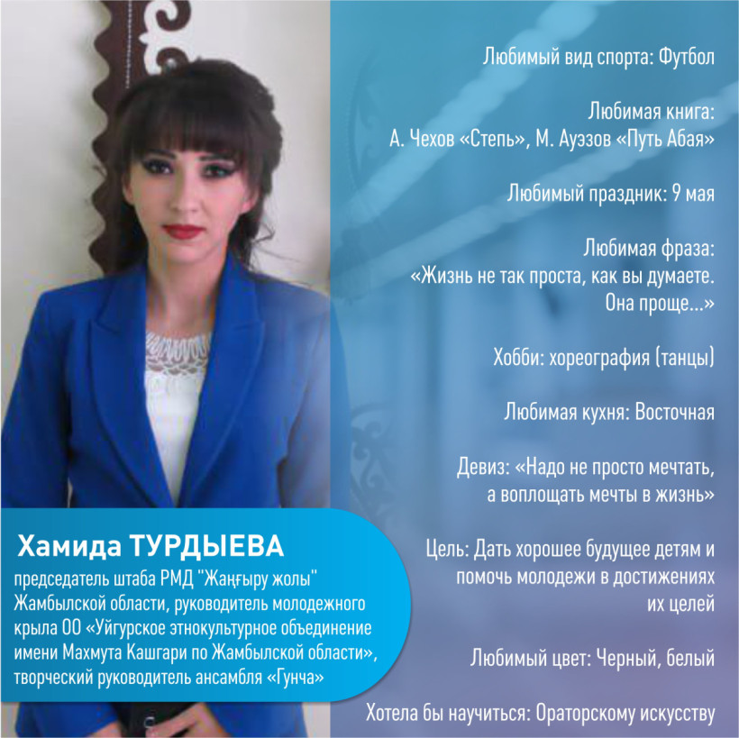 В 2016 году я стала работать менеджером в уйгурском культурном центре, а в прошлом году молодежь выбрала меня руководителем штаба РМД «Жаңғыру жолы» Жамбылской области. Многие спрашивают, зачем это мне нужно, говоря, что у меня есть семья, забот и работы итак много. Я хочу, чтобы мои дети росли в процветающей стране, где царят мир, единство и согласие, и чтобы они брали с меня пример и были патриотами своей страны.
