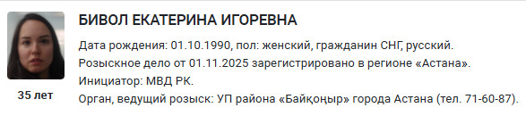 На сайте Комитета по правовой статистике Генеральной прокуратуры появилась ориентировка на Екатерину Игоревну Бивол, 1990 года рождения. Согласно данным, розыскное дело зарегистрировано 1 ноября в Астане по инициативе Министерства внутренних дел Казахстана. Исполнителем указано управление полиции района Байконур.