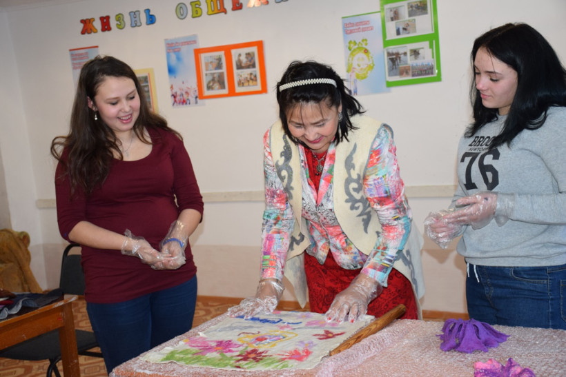 Мастерица Союза Гульнар Орынбаева не просто рассказала о различных техниках валяния из непряденой шерсти путем сцепления и переплетения ее волокон различными способами, но и вовлекла в работу учащихся колледжа. Девочки учебного заведения, а это будущие швеи, бухгалтера, не только узнали, что существуют различные виды валяния — сухое, мокрое, валяние вязаных вещей, но и под руководством Гульнар Мырзагалиевны собственноручно создали свой первый «шедевр» - панно «Позитивное настроение» из войлока.