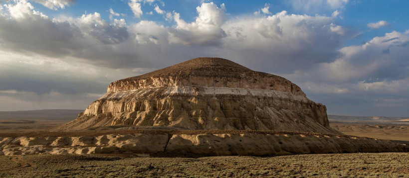 Сто семьдесят километров от Актау. Недалеко от поселка Шетпе скрылся родниковый оазис речки Акмыш. Рядом, посреди высохшей степи на пути древних караванов, проходящих между хребтами Каратауских гор, возвышается песчаная юртообразная Шеркала. Отвесные и изрезанные, но пологие к вершине известняковые склоны напоминают то перевернутую пиалу, то спящего льва – отсюда и туркменское название «Львиной горы».
