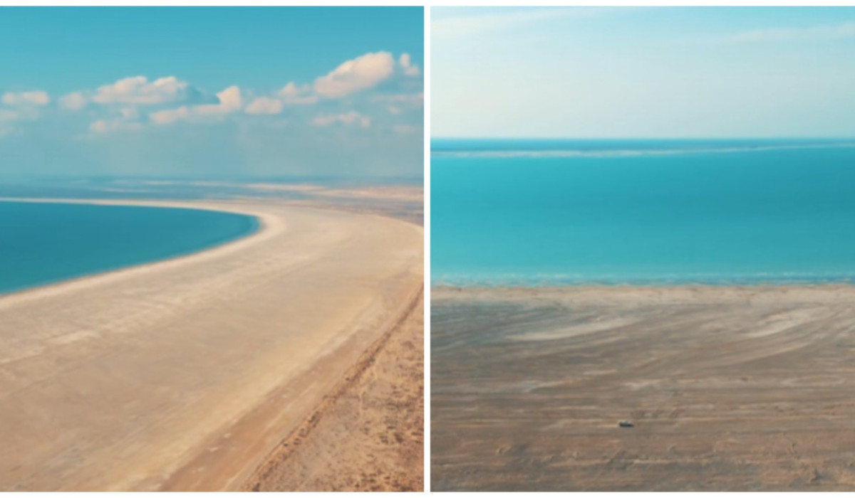 Оператор дрона снял с высоты птичьего полёта береговую линию Каспийского моря, которая отступила уже на километр, от предыдущей разметки, сообщает El.kz.