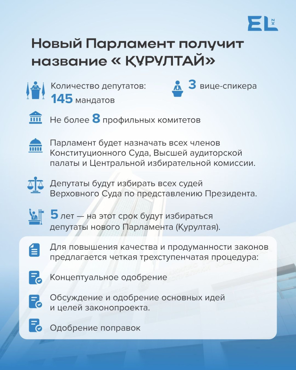 Касым-Жомарт Токаев выступил с инициативой назвать будущий Парламент Курултаем, подчеркнув историческую и смысловую близость этого понятия для казахстанцев. В традиции казахского народа курултай был формой общенационального собрания, на котором принимались судьбоносные решения - от выбора хана до определения законов и стратегических направлений развития.