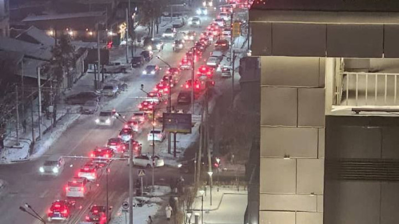 "На выезде, где Калкаман, столпились машины, пробка ужасная. все машины стоят на выезд из города. Паника, все сигналят".