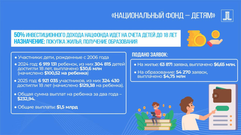 Общая сумма начисления составила 695,5 млн долларов США. Из общего количества детей, которым начислялись деньги из Нацфонда, 304 815 человек в 2024 году, достигли 18 лет, суммарно им было перечислено 30,6 млн долларов США.