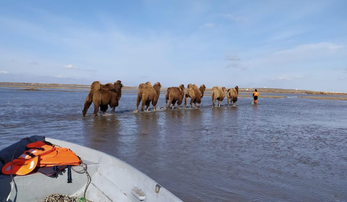 Животные паслись на поле, когда надвигалась талая вода. Испуганные водой, верблюды отказались двигаться с места. К месту происшествия прибыли спасатели под руководством заместителя начальника ДЧС Ерлана Молдаханова.
