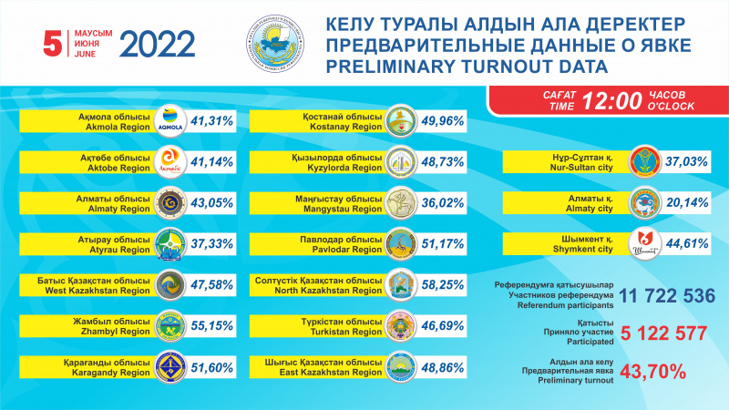 Согласно данным, представленным областными, городов республиканского значения, столицы комиссиями по состоянию на 12.00 часов 5 июня 2022 года бюллетени получили 43,70 % от общего количества граждан, включенных в списки, передает El.kz со ссылкой на ЦИК Казахстана.