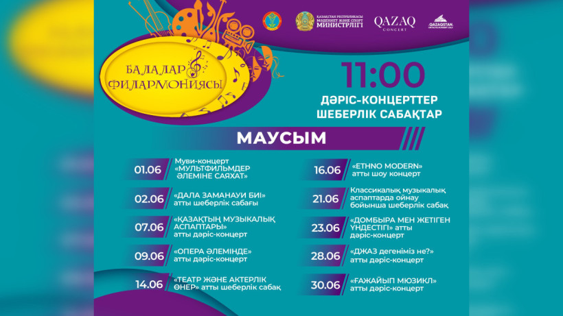 Во время школьных каникул ребята смогут на протяжении первого летнего месяца бесплатно посетить концерты, мастер-классы и послушать лекции с участием известных казахстанских артистов и получить памятные подарки.