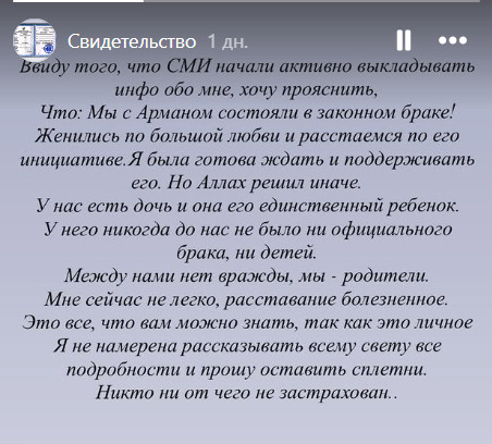 "Ввиду того, что СМИ начали активно выкладывать инфо обо мне, хочу прояснить: мы с Арманом состояли в законном браке. Женились по большой любви и расстаемся по его инициативе. Я была готова ждать и поддерживать его. Но Аллах решил иначе.