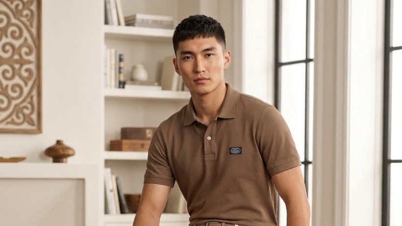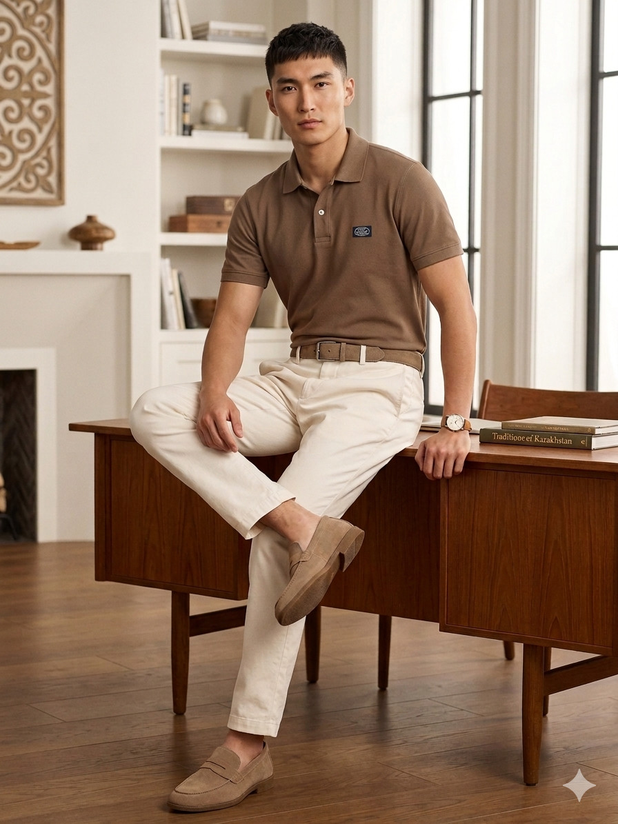 Образ с коричневым поло и кремовыми чиносами — это то, что в моде называют «тихой роскошью». Никаких лишних надписей, никакого шума — только чистый крой и правильно подобранный цвет. Замшевые лоферы в тон брюкам завершают образ так, что он читается как дорогой даже без единого люксового лейбла. Пояс в цвет обуви — деталь, которую замечают не сразу, но именно она делает весь лук цельным.