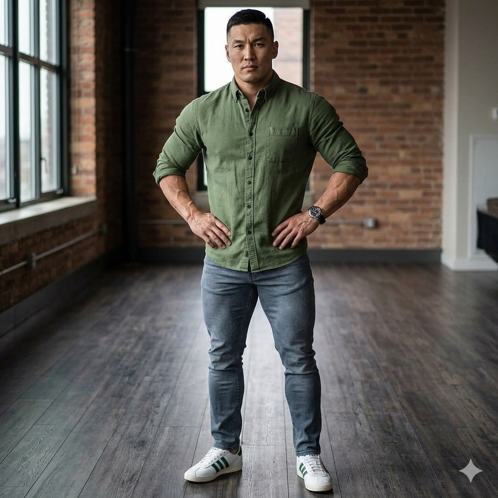 Оливковая рубашка из льна с закатанными рукавами и серые зауженные джинсы — один из самых мужественных и при этом ненавязчивых образов сезона. Такой лук особенно выигрывает на атлетичной фигуре, но работает на любой — главное, чтобы джинсы были по размеру, без провисаний. Белые кеды с цветной полоской дают образу нужную лёгкость и не дают ему скатиться в слишком серьёзный. Никаких украшений, минимум аксессуаров — только часы.