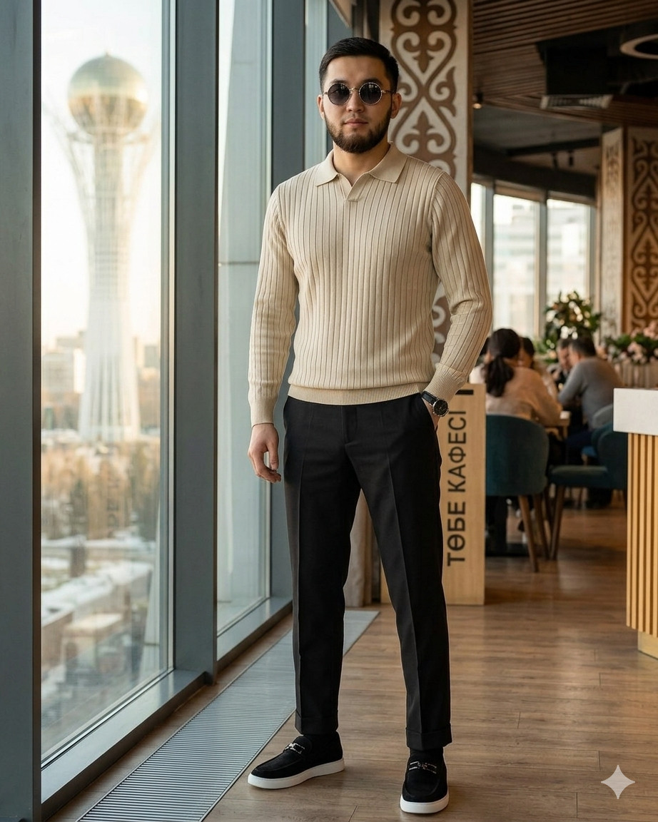 Бежевый вязаный джемпер с отложным воротником — вещь, которую в 2026 году носят вместо обычной рубашки. Он выглядит дороже, чем стоит, и даёт образу фактуру. В сочетании с тёмными зауженными брюками и лоферами это рабочий вариант для любого городского мероприятия — от деловой встречи до ужина. Очки с круглой оправой и часы завершают образ, не перегружая его.