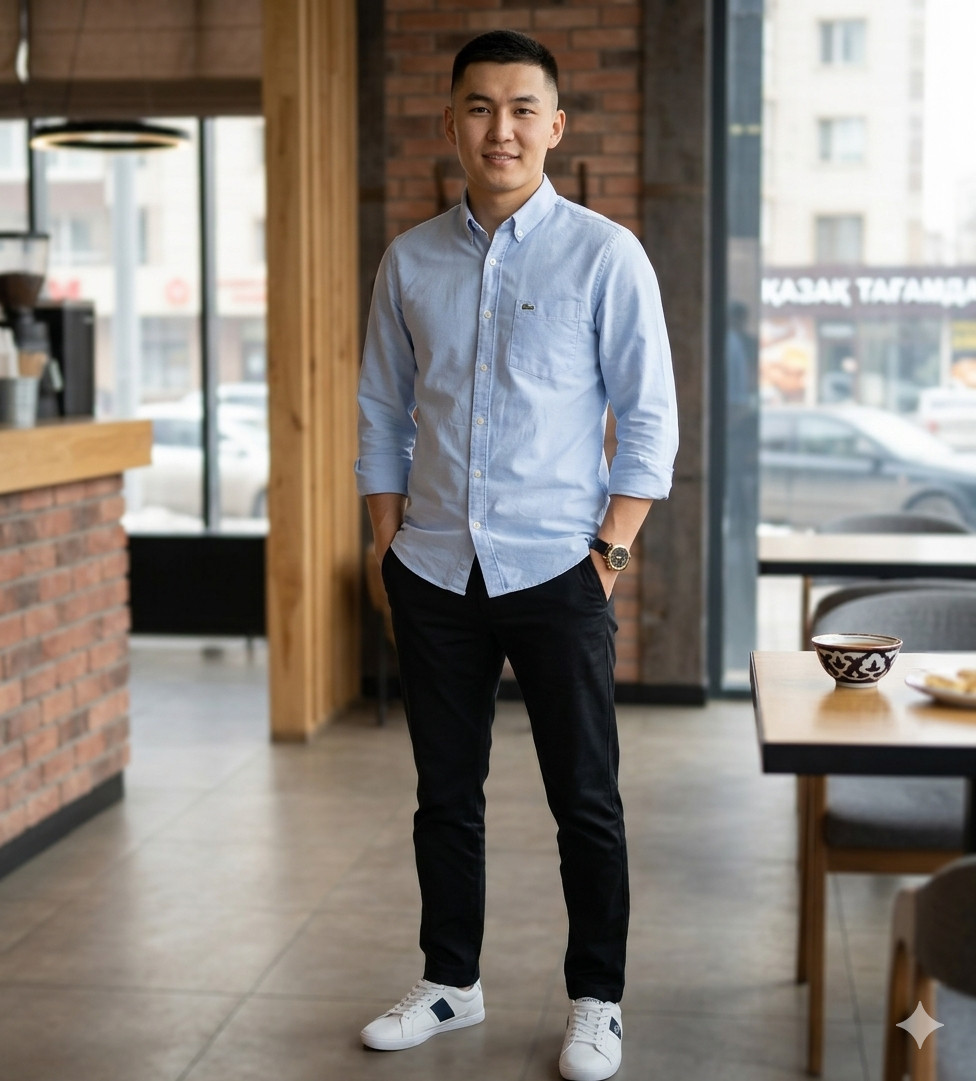 Голубая рубашка с закатанными рукавами и тёмные чиносы — это образ, который работает в 9 из 10 ситуаций. Белые кеды снижают градус официальности ровно настолько, чтобы выглядеть живым человеком, а не манекеном. Рубашку лучше оставить навыпуск — так пропорции выглядят естественнее, а силуэт — свободнее. Часы с золотым корпусом добавляют один акцент, которого вполне достаточно.