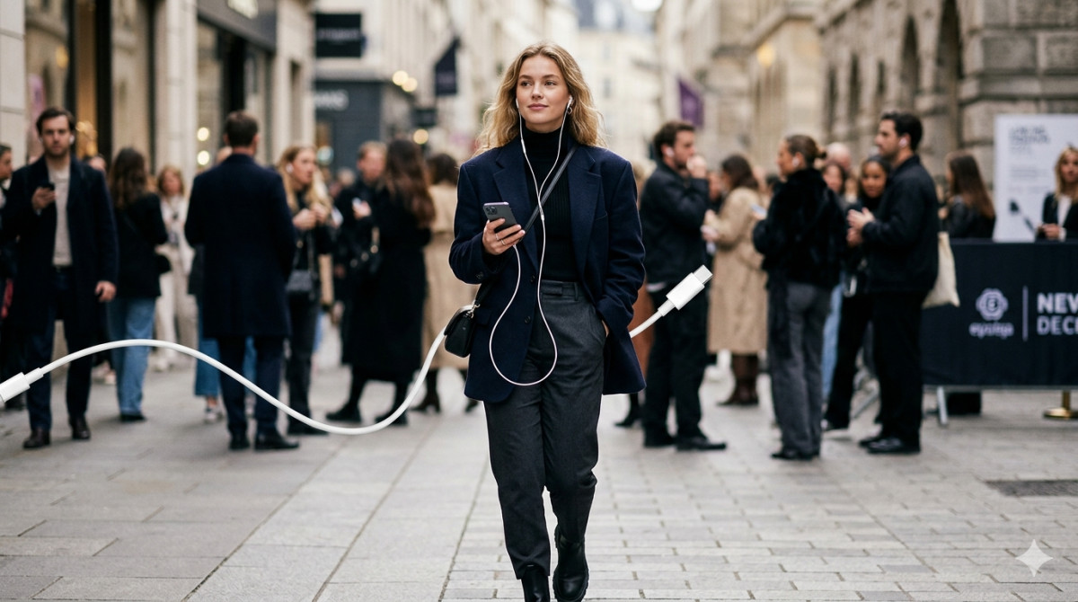 В 2023–2025 годах в соцсетях и на модных показах всё чаще начали появляться образы с проводными наушниками. Белый кабель снова стал заметным элементом – не скрытым, а, наоборот, подчеркнутым.