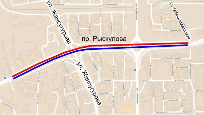 С 23:00 18 августа до 11:00 20 августа движение будет перекрыто на участке в восточном направлении от начала транспортной развязки Рыскулова - Жансугурова до ул. Табачнозаводская.