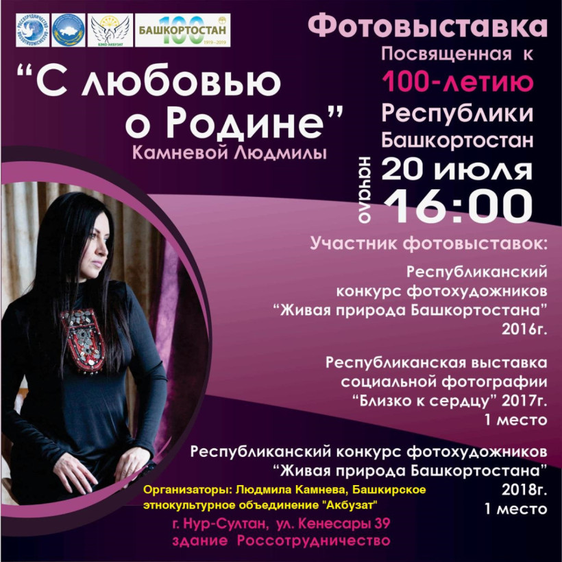 20 июля в 16 часов в Российском центре науки и культуры в Нур-Султане (ул. Кенесары, д. 39) состоится открытие фотовыставки «С любовью о Родине», приуроченной к 100-летию образования Республики Башкортостан.