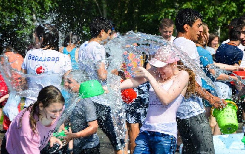 Участники армянского праздника, который начинается с раннего утра, по традиции «приветствуют» встречных обливанием воды из подручных средств – ковшей, ведер, водных пистолетов.