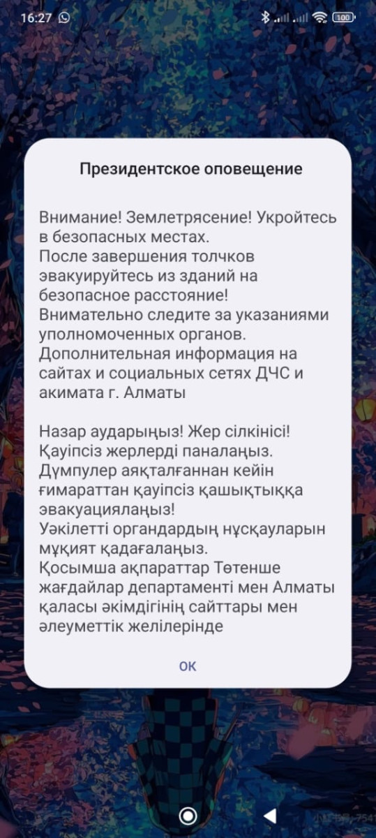 Новую систему оповещений внедрили, чтобы вовремя предупреждать граждан о приближающейся сейсмической активности. Такое президентское оповещение приходит не в виде SMS, а поверх всех открытых приложений.