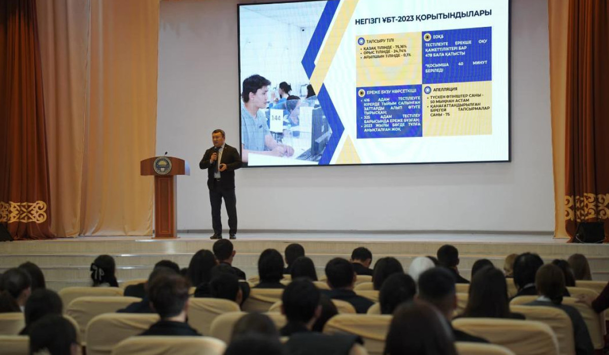 Мектеп бітіруші түлектермен кездесу барысында университет ректоры Думан Орынбеков шараның негізгі мақсаты мен мамандық таңдаудың маңыздылығын жете түсіндірді.