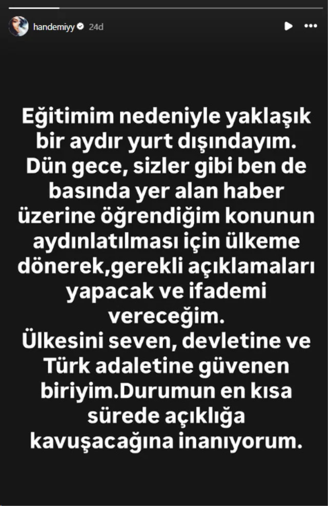 Әуелде Түркия басылымдары оның демалыста жүргенін жарыса жазған. Артынша актриса әлеуметтік желіде мәлімдеме жасап, оқу оқып жүргенін айтты. Әрі өзі туралы ақпаратты бұқаралық ақпарат құралдарынан білгенін де қосқан. Ол шамамен бір айдан бері оқуына байланысты шетелде жүргенін айтып, жақын арада Түркияға оралып, ресми органдарға түсініктеме беретінін мәлімдеді. Сондай-ақ актриса өз сөзінде Түркияға, мемлекетіне және түрік әділдігіне сенетінін атап өтті.