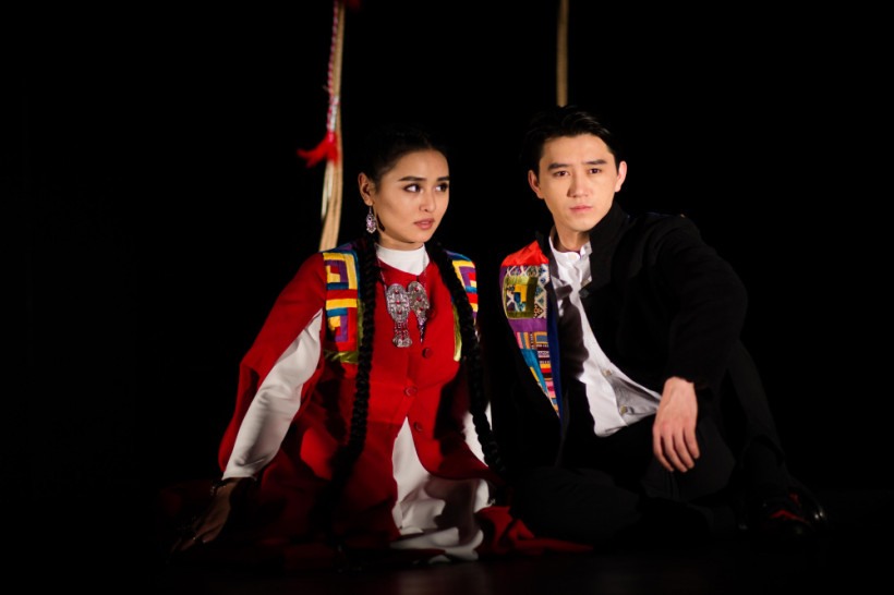 Әзер дегенде сұлудың көшіне жеткен сахнада актерлердің костюмдерін Қыз Жібектің (Аида Жанзакова) үстіне іліп, актрисаның алдыға қарап, барлық киімдерді үстінен лақтырып, жүзін көрсеткен эффекті сахнада ғана көрермен бас кейіпкерді бейнелеген актрисамен танысады.